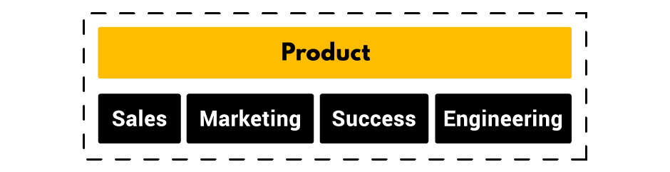 In a sales-led approach, the revenue-generating teams on the left (sales, marketing, and customer success) are typically separated from the cost-generating teams on the right (engineering and product). In this approach, the sales team is often given priority over the product team, which may result in the latter being pressured to make hasty modifications to the product in order to close deals with big clients. As a result, the company's focus can be shifted away from building a product that truly meets the needs of its intended users and towards satisfying the demands of potential customers, which can be detrimental to the product's long-term success.